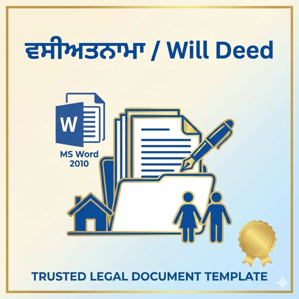 ਇਹ Vasiyat (Will Deed) ਫਾਰਮੈਟ ਪੂਰੀ ਤਰ੍ਹਾਂ ਗੁਰਮੁਖੀ ਲਿਪੀ ਵਿੱਚ ਤਿਆਰ ਕੀਤਾ ਗਿਆ ਹੈ ਅਤੇ Microsoft Word 2010 ਅਤੇ ਉੱਪਰ ਵਿੱਚ ਆਸਾਨੀ ਨਾਲ ਐਡਿਟ ਕੀਤਾ ਜਾ ਸਕਦਾ ਹੈ।